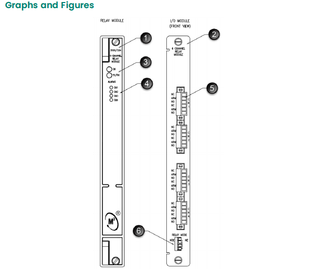 The 4-Channel Relay Module is a full-height module that provides four relay outputs. Any number of 4-Channel Relay Modules can be placed in any of the slots to the right of the Transient Data Interface Module. Each output of the 4-Channel Relay Module can be independently programmed to perform voting logic.
