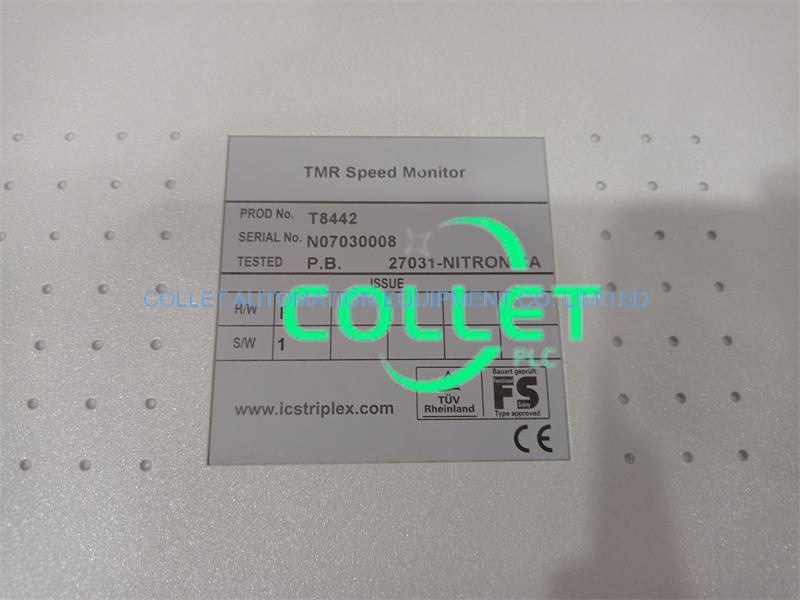 The Trusted® T8442 TMR Speed Monitor monitors the shaft speed and acceleration of rotating machinery. It provides machine protection for over-speed and over-acceleration shutdown functions. Typical machinery applications include steam and gas turbines driving pumps, compressors and generators. A T8442 Speed Monitor Module within a Trusted System provides the capability to perform turbine speed control independent of the machinery protection functions. System response times are often critical for these types of application. To minimize processing delays the T8442 operates as a self-contained fault tolerant control sub-system within the Trusted System environment. Each T8442 has three monitoring and control groups. Each group provides the Speed Monitoring and shutdown control facilities required for one rotating machine. Up to three turbine trains can be handled by a single T8442. A single rotating machine group comprises of three separate Triple Modular Redundant (TMR) speed input channels and two separate quad redundant, fault tolerant output drive structures. Turbines having more than three speed pickups can be accommodated by combining monitoring and control groups. The speed input channels are designed to interface directly with a Trusted T8846 Speed Input Field Termination Assembly (SIFTA). A single T8846 provides signal conditioning and field cable termination facilities for the nine TMR speed input channels required for three rotating machine groups. Both active and passive speed probes can be accommodated by the T8846. Active probes can be powered from the field cable termination. The shutdown control outputs are designed to interface directly with three Trusted T8891 Speed Output Field Termination Assemblies (SOFTA). A single T8891 contains the two quad redundant, fault tolerant, volt-free contact structures required for a single rotating machine group. The inter-connections between the Module and the Field Termination Assemblies (FTAs) are provided by a Trusted TC-801 Cable Assembly.